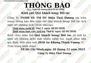 Công Ty TNHH SX TM DV Điện Thái Dương xin trân trọng thông báo đến toàn thể Quý khách hàng/ Đối tác nghỉ tết (dương lịch) 2026 như sau: