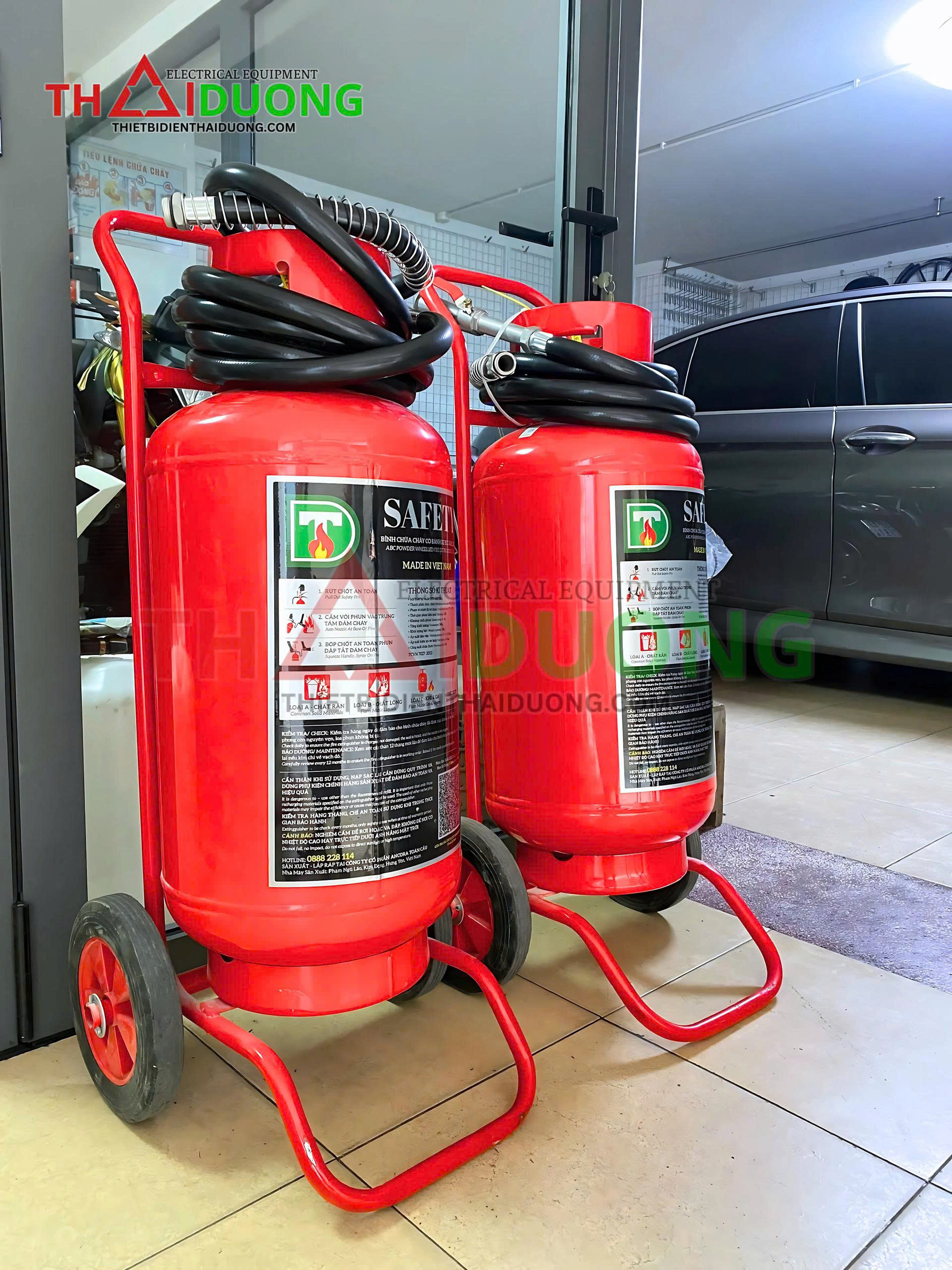 Đây là giải pháp tối ưu cho nhà xưởng rộng lớn. Đặc điểm: Dung tích lớn (thường là 24kg hoặc 35kg), có gắn bánh xe chịu lực và tay cầm dài. Công dụng: Cho phép một người di chuyển nhanh chóng đến đám cháy, phun bọt/khí ở khoảng cách xa và thời gian dài hơn hẳn bình xách tay, dập tắt đám cháy diện rộng hiệu quả.